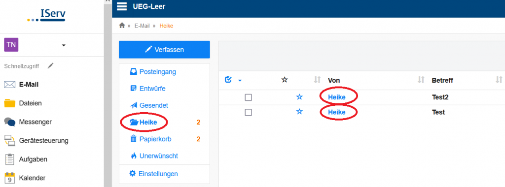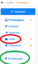 Wird in den E-Mail-Einstellungen (grün) der Ordner Heike (rot) hinzugefügt. Können mit einem Sieve-Script (siehe 3.) alle Mails von Heike automatisch in diesen Ordner (rot) verschoben werden.